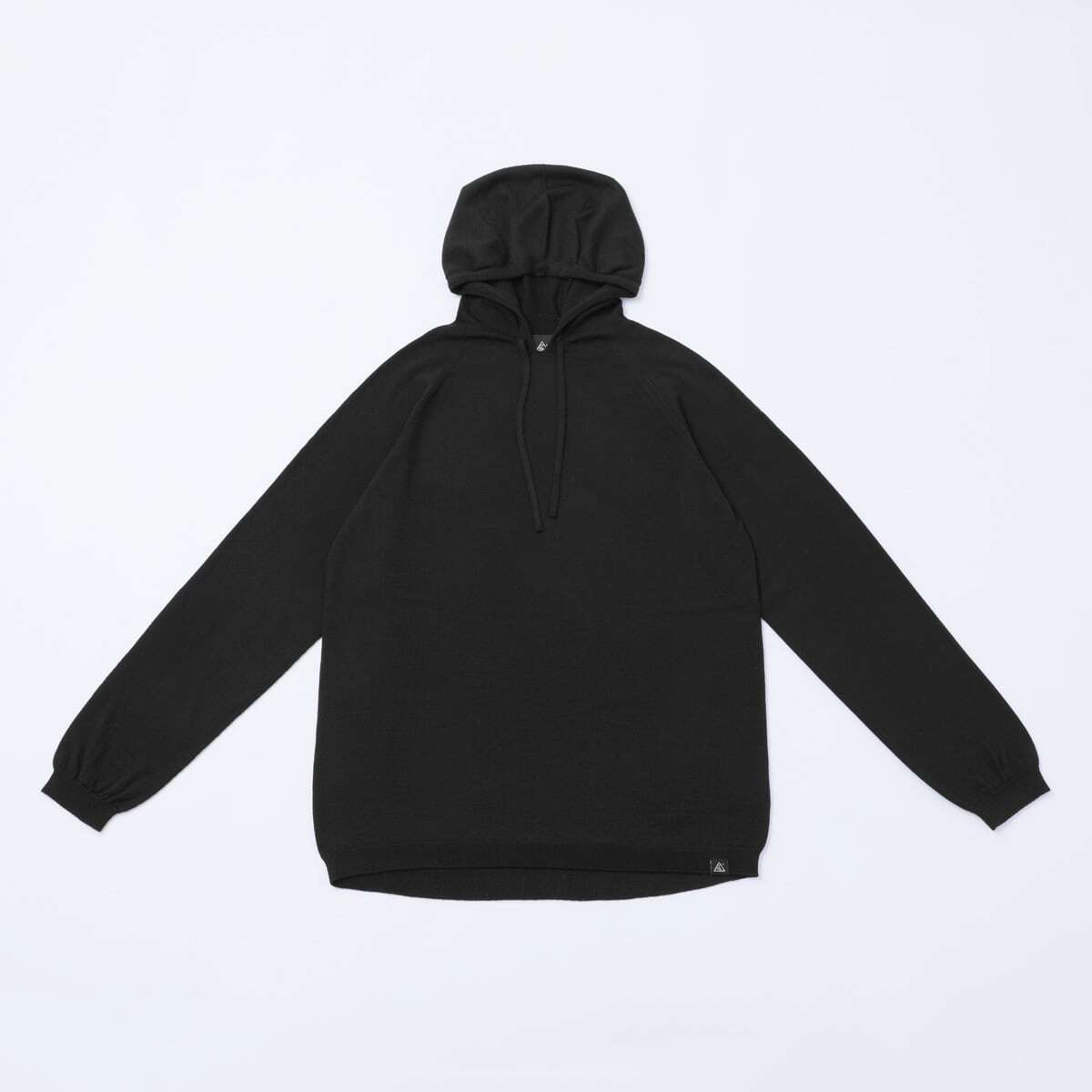 着用感が驚くほどストレスフリーなのは、ホールガーメント®で無縫製で仕上げているから。フード紐も同じくメリのウール100%というこだわりです。