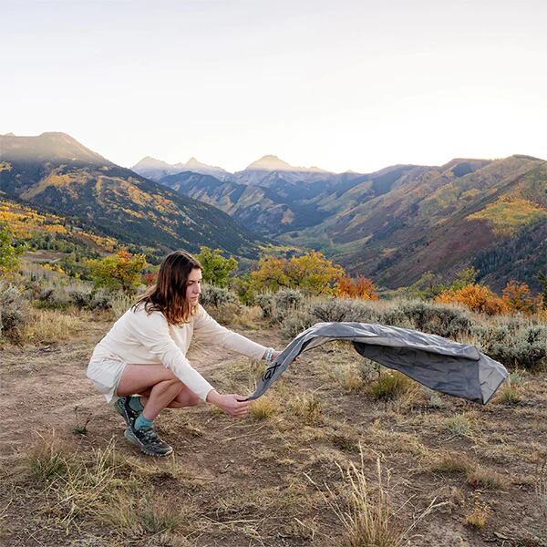 キーホルダーに付けたり、バッグやポケットに入れていつでもどこでも手軽に携帯ができ、パッと取り出し、サッと座ることができます。ピクニックや公園、ビーチ、花火大会、野外フェス、スポーツ観戦など、あらゆる場面で大活躍すること、間違いなしです。耐水性があるので濡れた草むらなど、座る場所を選びません。急な雨の時などに羽織れば一時的な雨除けにもなります。コーナーにテザーポイントを施しているので、お手持ちのペグを使用してペグダウンすることも可能です。リップストップポリエステルを採用し、強度をアップしています。